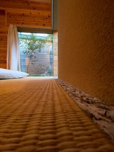 扉はシナ合板で、床材より少し濃く塗装していますので、