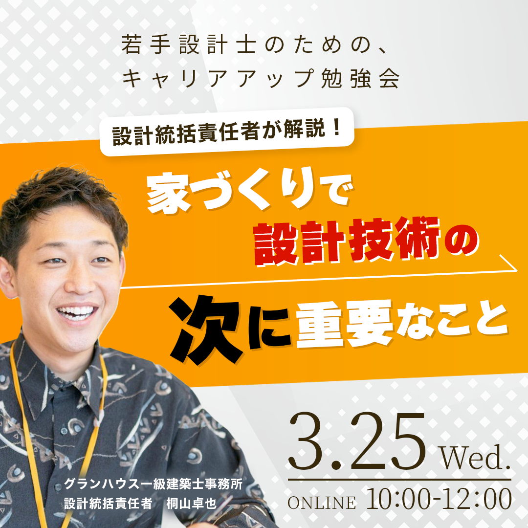 そんな想いから、社内研修の内容を活用し「若手設計士のためのキャリアアップ勉強会」を主催することにしました!この勉強会で話す内容は、他では得られないと思います。小手先のテクニックではなく、私たちグランハウスが時間をかけて築き上げてきたノウハウです。