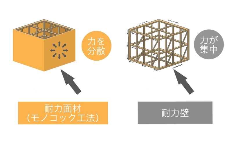 2.7倍以上の壁倍率を持つ耐力パネルと筋交いをかけ合わせた木造軸組パネル工法(モノコック工法)であれば、地震や台風の強い力が一気に加わっても、簡単に割れや欠損を生じる事がありません。