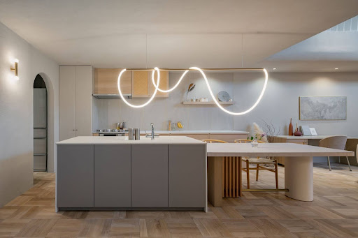 マットな質感の天板やキャビネットが落ち着いた雰囲気を生み、間接照明と木目の天井が上質さをさらに引き立てます。大きな窓から自然光が差し込み、スタイリッシュでありながら開放感も感じられる贅沢なキッチンです。