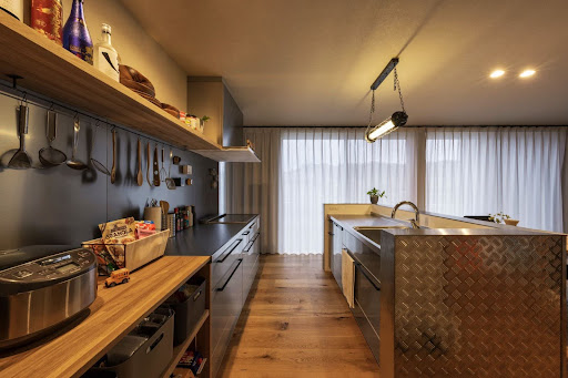 アイランド側には存在感のあるステンレスパネルを採用し、無骨さと高級感を両立。背面にはオープン棚とブラック天板を備え、調理器具や食材を機能的に配置できます。デザイン性と作業効率を兼ね備えた、大人のためのキッチンです。