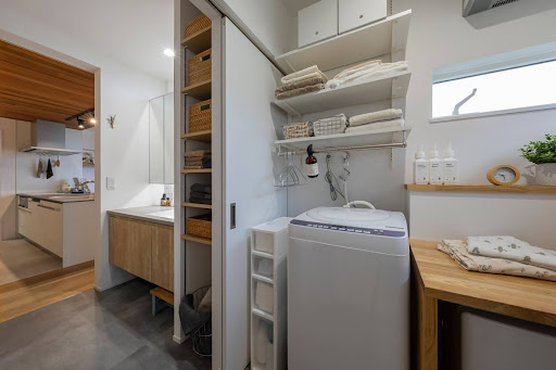 料理をしながら洗濯や入浴の準備ができ、移動距離も短くて負担が少ないのが魅力。収納も充実しており、タオルや洗剤、掃除用品などをすぐに取り出せます。共働きや子育て世帯など、限られた時間で家事をこなしたい家庭に最適な間取りです。