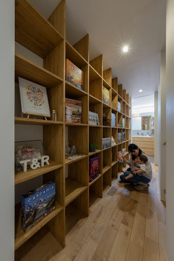 廊下の片側いっぱいに設けられた大容量収納は、本や雑貨、趣味のコレクションをたっぷりしまえる便利なスペースです。オープン棚にすることで出し入れがスムーズになり、ディスプレイ感覚でお気に入りの物を飾れますね。
