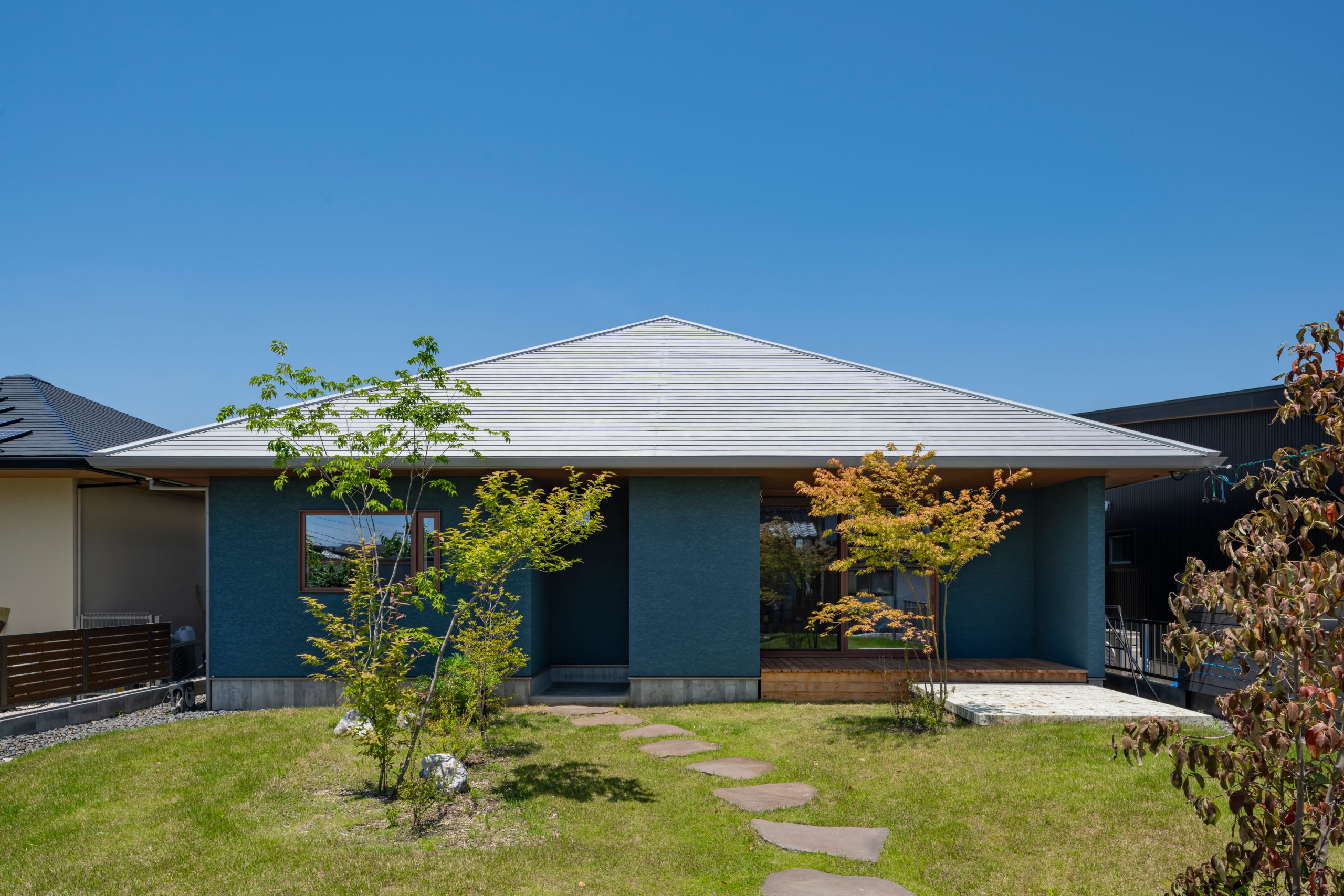 柔らかな芝の緑と石のアプローチが外観を引き締め、落ち着きのある雰囲気を演出しています。