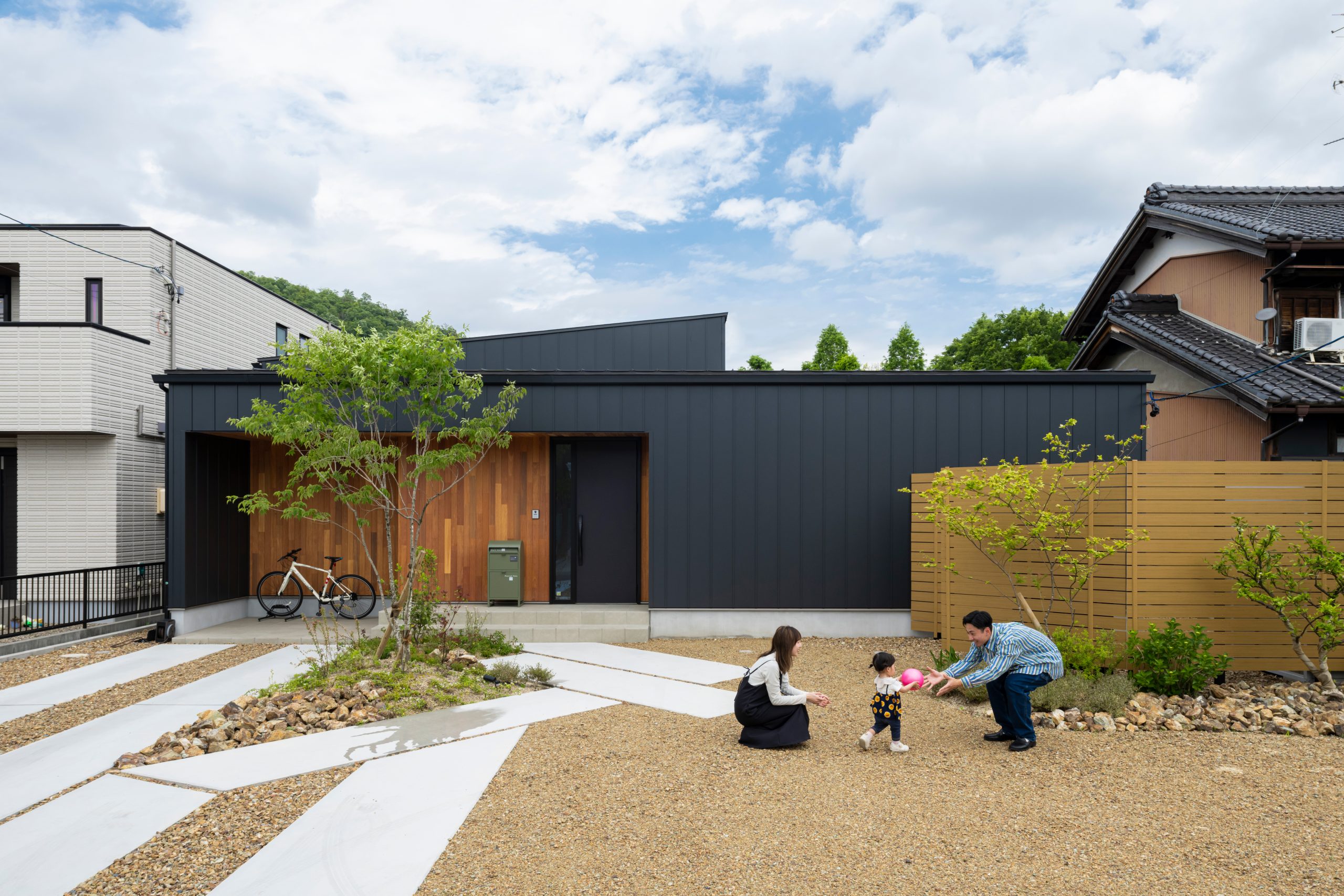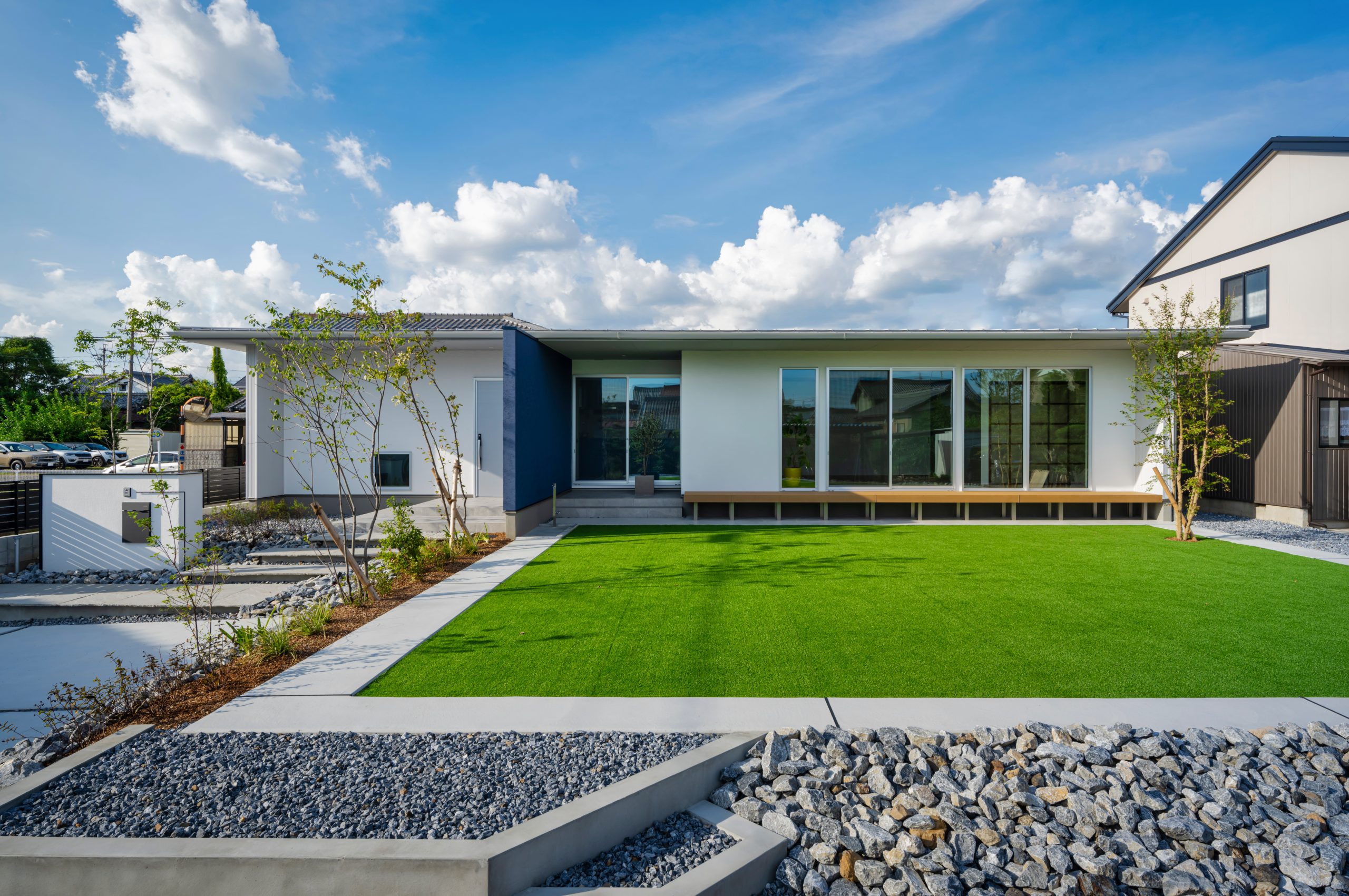 この建築事例では、砂利と芝を組み合わせたハイブリッドな庭が特徴です。