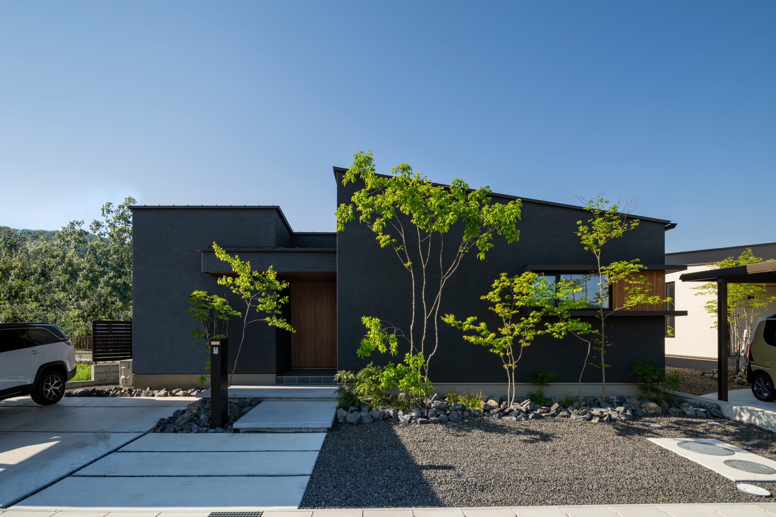 玄関までの動線も美しく、外観全体に上質さが漂う仕上がりです。