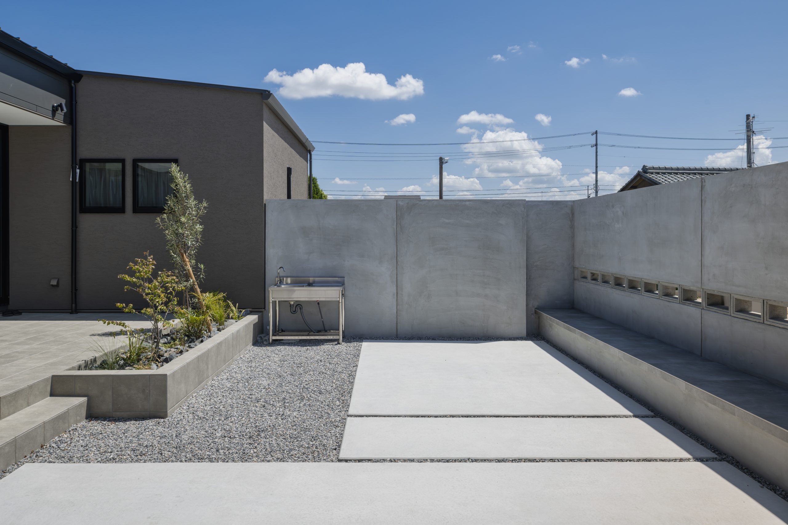 この建築事例では、ブラウンの砂利とコンクリートを組み合わせたデザイン性の高い庭が特徴です。