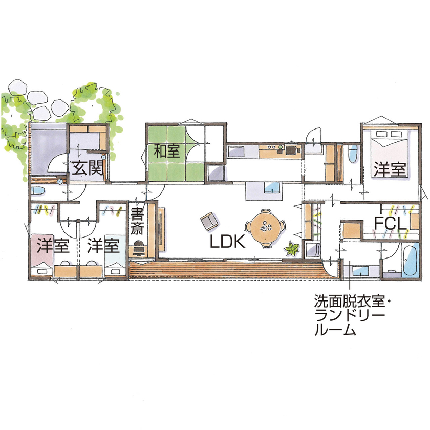 LDKを中心に洋室3部屋と和室を配置し、家族それぞれのプライベート空間を確保。
