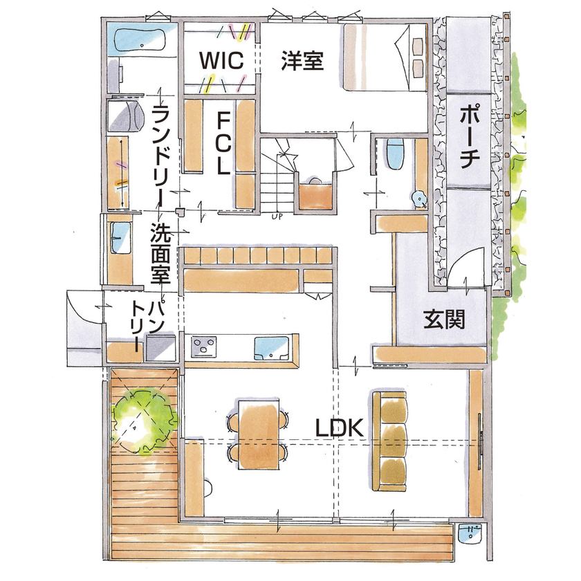 この建築事例では、家事動線の工夫と屋外とのつながりを楽しめるウッドデッキが特徴です。