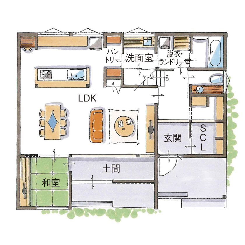 玄関から洗面・浴室までを一直線につなぐ生活動線により、帰宅後の流れもスムーズです。