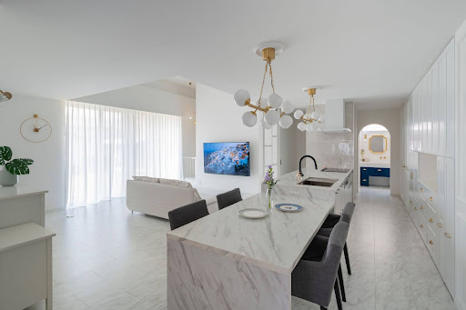 キッチンやダイニングテーブルも大理石柄で統一され、まるでホテルのラウンジのような高級感とリゾート感が漂います。天然石ならではの艶やかな質感と重厚感が、日常を特別な時間に変えてくれるのも魅力的。