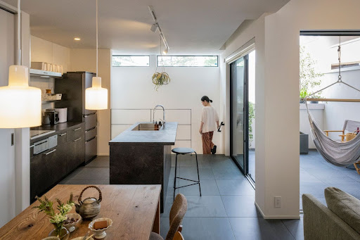 室内と中庭の床に同じタイル素材を使うことで、まるでリゾートのような高級感ある雰囲気に。サッシを開ければすぐに外へ出られ、天気のいい日は大きめの家具を外に出してくつろぐこともできます。
