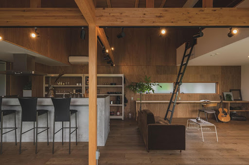 この建築実例の特徴は、平屋でありながら大きな吹き抜けを設け、梯子でロフトへとつながる立体的なリビング空間を実現している点です。