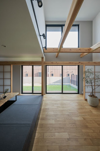 この建築実例の特徴は、吹き抜け部分に設けられた大きな窓と障子の組み合わせで、光をやさしく取り込める点です。