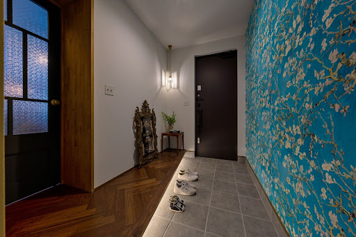 こちらの住宅の玄関は、鮮やかなブルーのアクセントクロスが印象的な空間です。