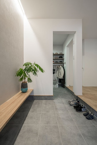 こちらの住宅の玄関は、壁際に設けられた木製ベンチが印象的です。