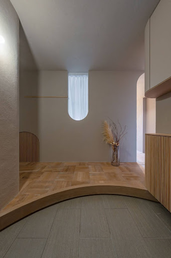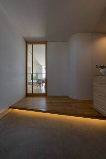 直線をできるだけ排し、床の縁や開口部、壁面のフォルムまで丁寧にカーブを描くことで、穏やかで上品な雰囲気を演出しています。