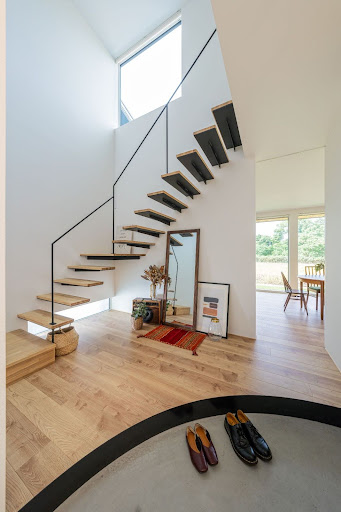 こちらの住宅の玄関は、広々とした土間スペースが印象的で、まるで小さなギャラリーのような雰囲気を漂わせています。