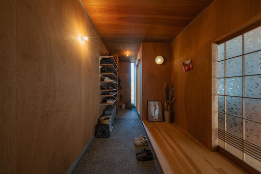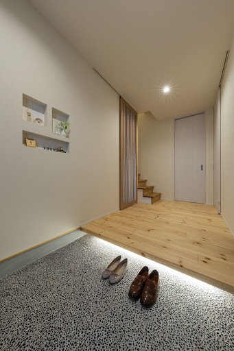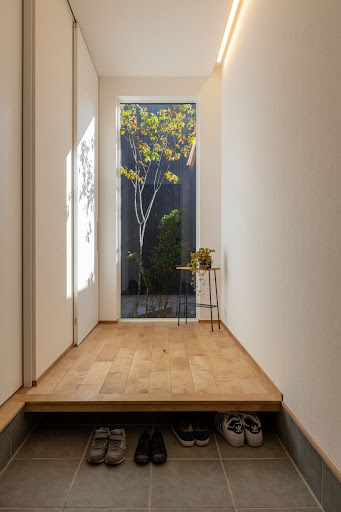 こちらの住宅の玄関は、まるで室内へ吸い込まれていくような奥行きを感じさせるデザインが特徴です。
