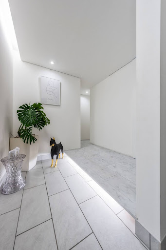 大理石調の床と白壁が調和し、光を反射して空間全体を明るく見せています。