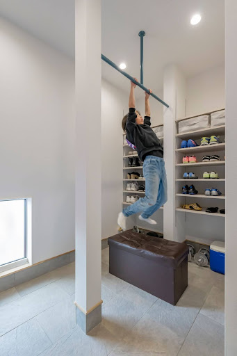 天井には懸垂バーを設置し、子どもも大人も気軽に体を動かせるちょっとしたトレーニングスペースに。