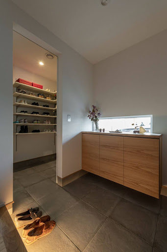 こちらの住宅の玄関は「見せる収納」として設計されたゆとりある空間です。