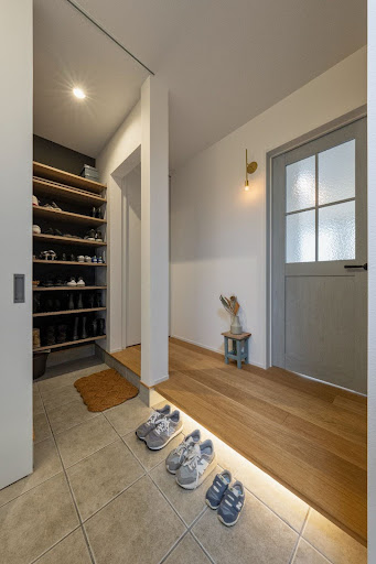 こちらの住宅の玄関は、ウォークインタイプのシューズクローゼットを備えた機能的な設計が魅力です。