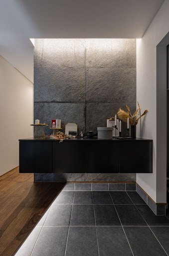 重厚感のある石調の壁面とブラックの収納が調和し、まるでホテルのエントランスのような高級感を漂わせています。