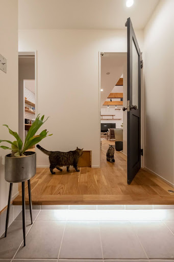 足元のライトが玄関をやさしく照らし、猫たちものびのびと動き回れる、家族全員にとって心地よい住まいとなっています。