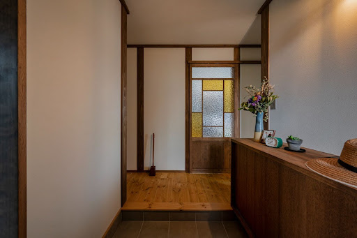 こちらの住宅の玄関は、美しいステンドグラスが目を引く温もりある空間です。