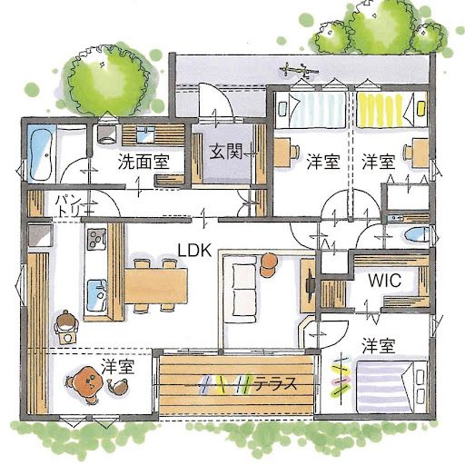 キッチン横のパントリーや洋室のウォークインクローゼットなど収納も充実。リビングから続くテラスは外遊びやBBQにも最適で、屋内外を緩やかにつなぐ空間設計が魅力です。シンプルながら使い勝手の良い、子育て世帯に人気の平屋住宅です。