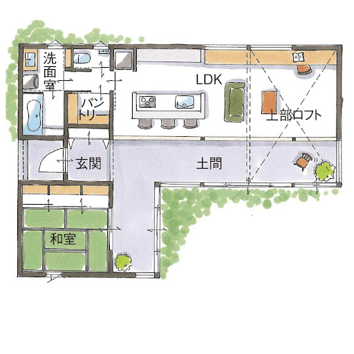 この建築事例では、広い土間とLDKを組み合わせた自由度の高い空間設計が特徴です。