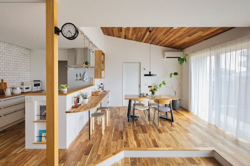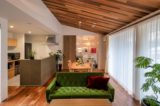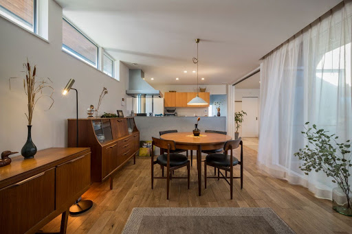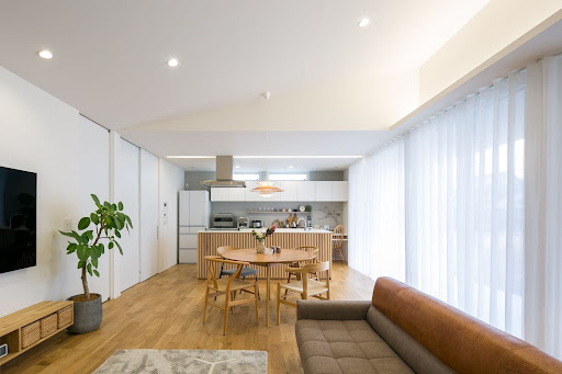勾配の天井と大きな窓からたっぷりと光が差し込み、家全体を明るく照らします。平屋でありながら縦の空間を最大限に活かすことで、空間に広がりと奥行きが生まれ、実際の面積以上に広々と感じられます。