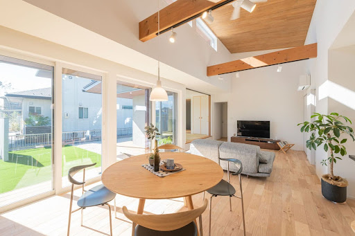 リビングやダイニングに設けられた大きな窓からは、たっぷりの自然光が降り注ぎ、室内を明るく照らします。ウッドデッキやテラスとシームレスに繋がることで、内外の境界が曖昧になり、空間の広がりを最大限に活かした開放的な暮らしを実現してくれます。