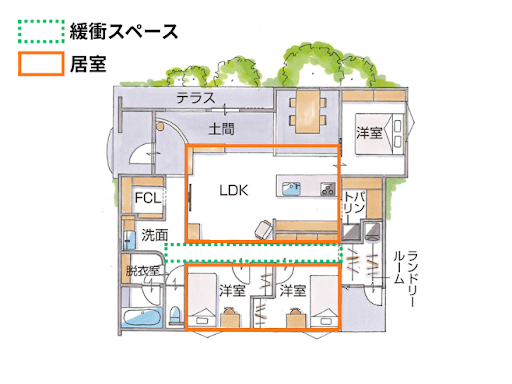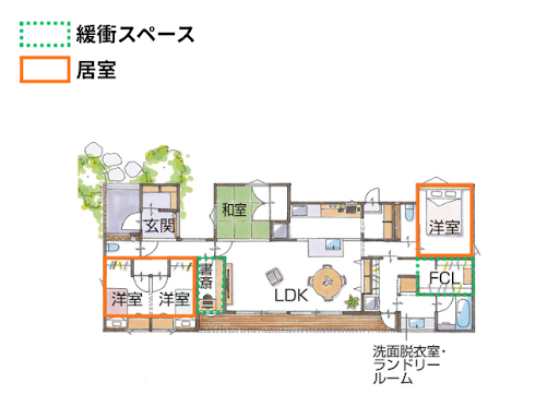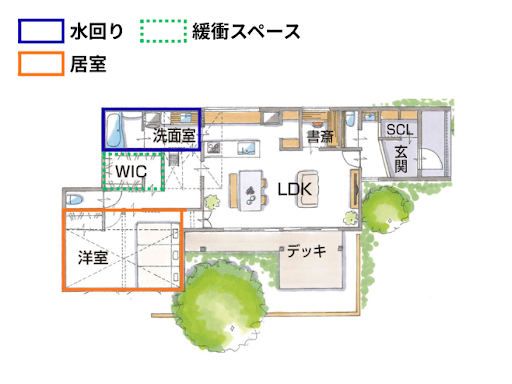 なお、水回りに隣接するスペースは寝室や子ども部屋などの居室ではなく、収納や廊下にするとさらに効果的です。