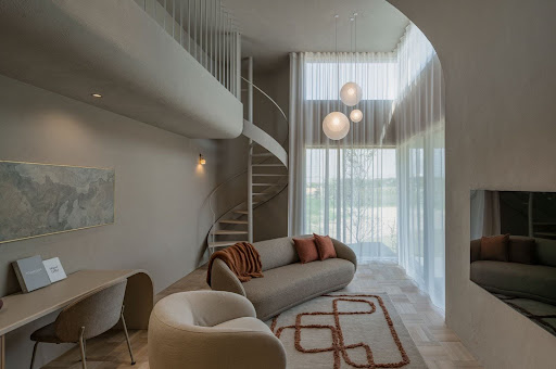 らせん階段は、1本の柱を軸に踏み板を螺旋状に配置した階段で、空間にアクセントを加える存在感のあるデザインです。