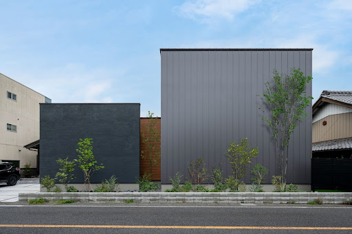直線的でシンプルなフォルムが都会的な雰囲気を演出しながらも、植栽の緑が柔らかさを添え、調和のとれた美しい外観を実現しています。