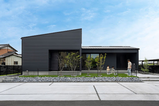 外観をブラック一色で統一することで、シンプルながらも圧倒的な存在感を放つ住宅。