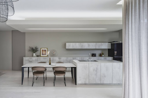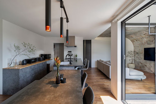 石調のキッチンカウンターやモダンな照明、落ち着いた色味のインテリアが非日常感をプラス。