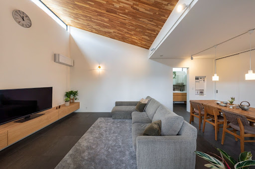 勾配天井に張られた木目のデザインが、空間全体を温かみのある雰囲気に演出し、シンプルなインテリアと調和。