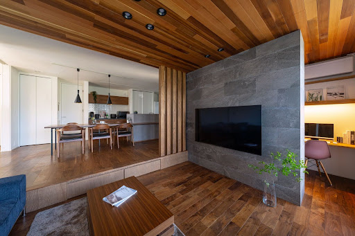 リビングの一角に設けられた小上がりの座敷は、空間にメリハリを与えるだけでなく、モダンでスタイリッシュな雰囲気を演出しています。