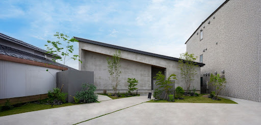 片流れの屋根と無機質なコンクリート調の外壁が特徴的で、まるで美術館を思わせる洗練された佇まい。