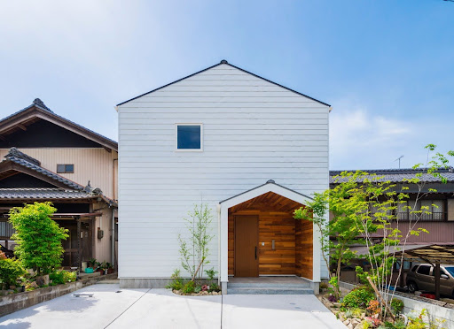 外観は白いラップサイディングと切妻屋根を組み合わせた、シンプルながら個性のあるデザインが魅力。玄関まわりに木目の素材を取り入れたポーチがアクセントとなり、温かみのある雰囲気を演出しています。周囲の住宅街にも馴染みつつ、さりげなく存在感を放つ外観です。