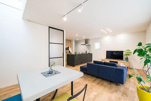 室内は白を基調とした明るい空間に、木の質感を活かした床材や、落ち着いたトーンのキッチンが調和したナチュラルモダンなインテリア。リビング・ダイニング・キッチンがゆるやかにつながる広がりある間取りで、家族が自然と集まりやすい居心地の良さを実現しています。