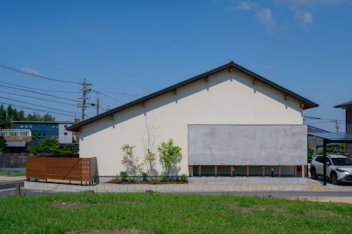 外観は切妻屋根と白壁を組み合わせた、素朴で温かみのあるデザインが特徴。過度な装飾を排し、素材感を生かしたシンプルな仕上げにすることで、施工コストを抑えながら上質さも両立しています。道路側に大きな開口部を設けず、あえて閉じた外観にすることで、プライバシーを守りつつ落ち着いた佇まいを実現しています。