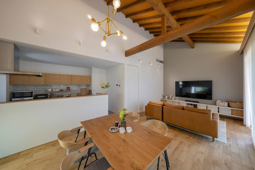 室内は勾配天井と現し梁の組み合わせによって開放感が生まれ、35坪前後とは思えない広がりを感じられる空間に。リビング・ダイニング・キッチンを一直線に配置したシンプルな動線が、家事のしやすさと居心地の良さを両立しています。木のぬくもりを活かしたインテリアが、家族が自然と集まる温かい雰囲気を演出しています。