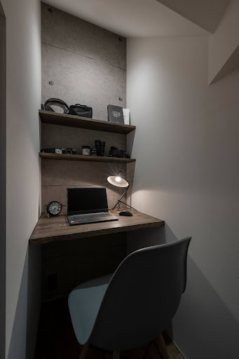 限られた空間ながらも、木製カウンターとシンプルなチェアを配置することで、落ち着いて作業できる環境を実現。お気に入りの本や小物、間接照明をディスプレイすれば、インテリアとしてもおしゃれな印象になりますね。