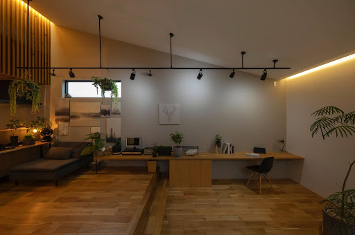 壁際に長く伸びるカウンターデスクなので、宿題中のお子さんや、仕事中のお父さんお母さんが並んで使うこともできます。天井のライティングレールが空間全体を明るく照らしているので、夜でも快適に作業できるのは嬉しいですね。