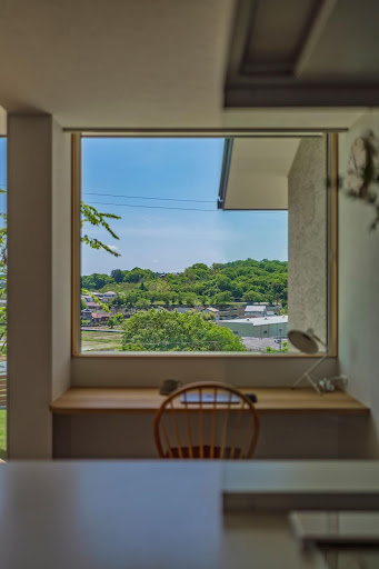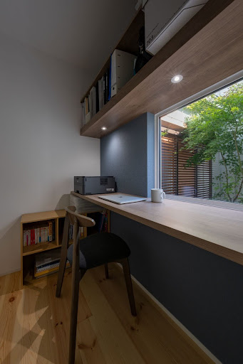 大きな窓から柔らかな自然光が差し込み、外の緑を眺めながら作業できるため、作業をしながらリフレッシュできますね。また、木のカウンターデスクと壁面収納を組み合わせることで、限られたスペースでもスッキリと整理された印象に。パソコン作業や読書、勉強など、静かに集中したい時間にも最適です。