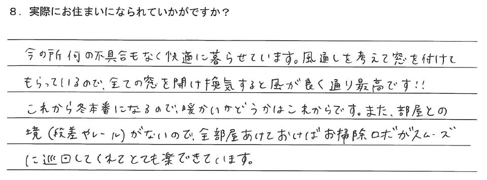 今の所何の不具合もなく快適に暮らせています。風通しを考えて窓を付けてもらっているので、全ての窓を開け換気すると風が良く通り最高です!!これから冬本番になるので、暖かいかどうかはこれからです。また、部屋との境(段差やレール)がないので、全部屋あけておけばお掃除ロボがスムーズに巡回してくれてとても楽できています。